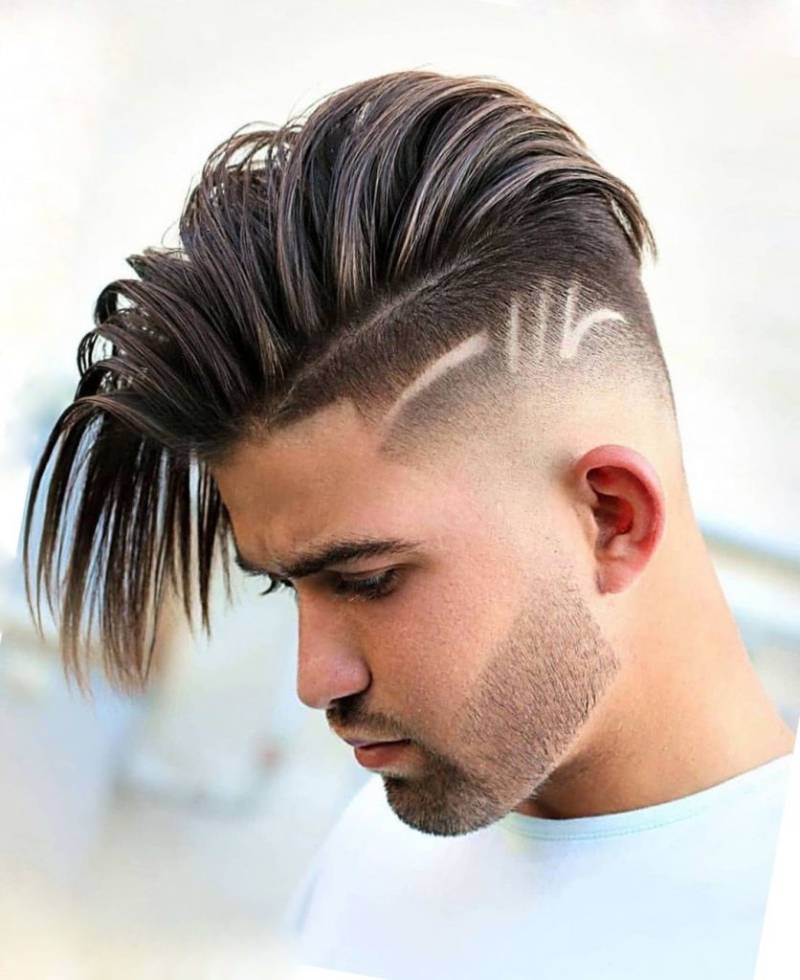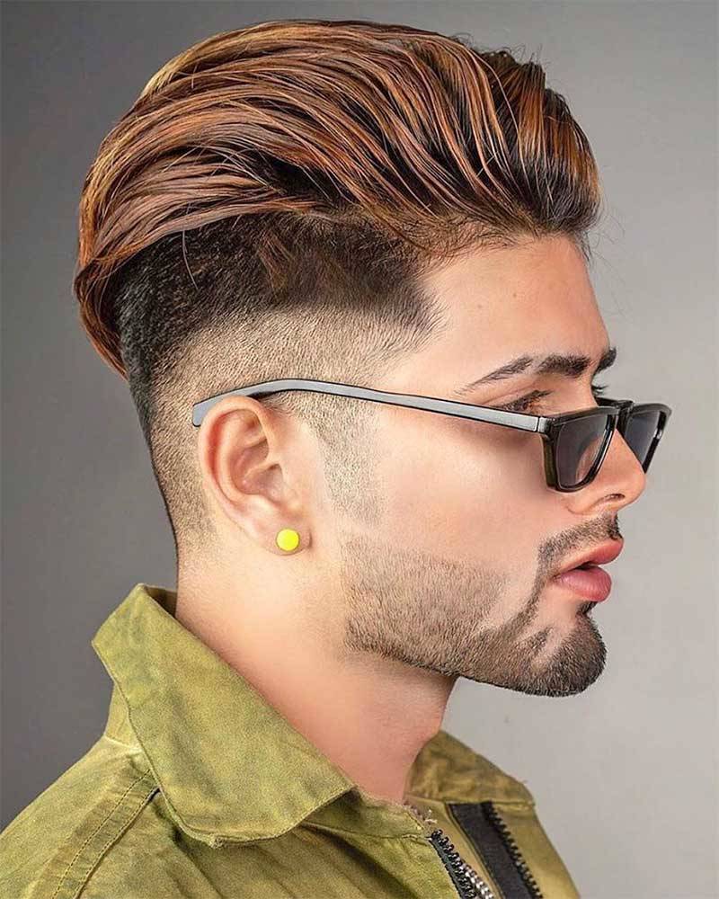 - Помпадур с элементами АндеркатаВыглядит ярко, экстравагантно. Основную массу волос оставляют длиною не менее 10 см, укладывая набок, выделяя пробор. Область висков стрижется контрастно коротко или выбривается. Переход начинается у висков, подчеркивая объем шевелюры теменной зоны. Прическа требует регулярной коррекции у мастера, использования укладочных средств. Стильный образ можно дополнить бородой или усами.