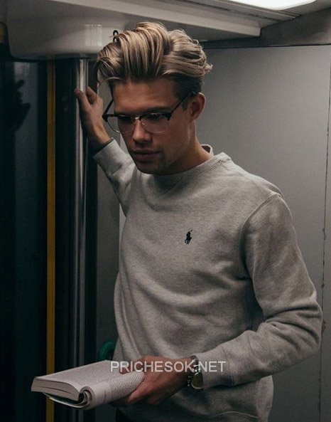 Современная небрежная вариация отличается неоднородностью структуры. Пряди зачесывают назад, но слегка разделяют. Для получения такого эффекта достаточно пальцами с небольшим количеством воска или геля пройтись по готовому хохолку. Способ укладки подойдет для обладателей слегка вьющейся шевелюры.