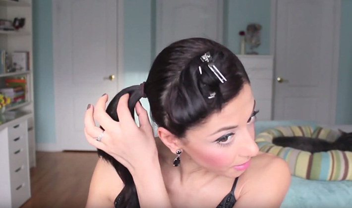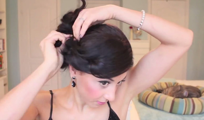 Сделайте начес для объема, после чего оберните хвост вокруг резинки и заколите невидимками, чтобы получился пучок.