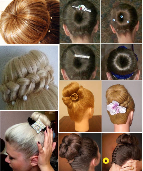 Прическа с бубликом позволяет использовать огромное количество декоративных элементов. Это могут быть: красивые резинки, шпильки с оригинальными красивыми головками (жемчужины, стразы), искусственные или даже живые цветы. Такие украшения придадут вашей прическе особый шарм и красоту.