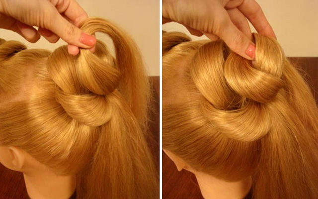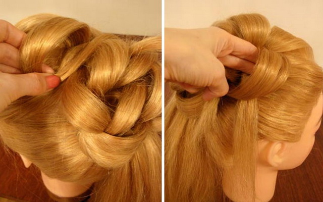 - Четыре пряди выкладываются по кругу, пятая же прядь помещается в центре круга выше остальных.