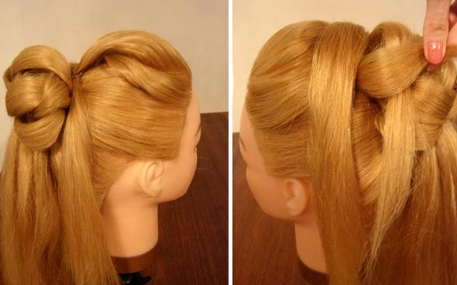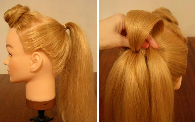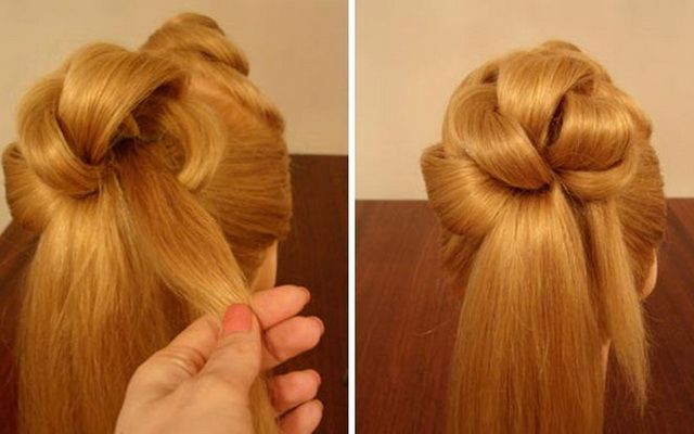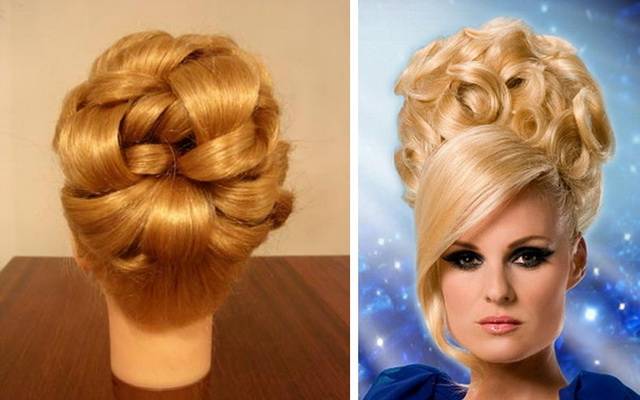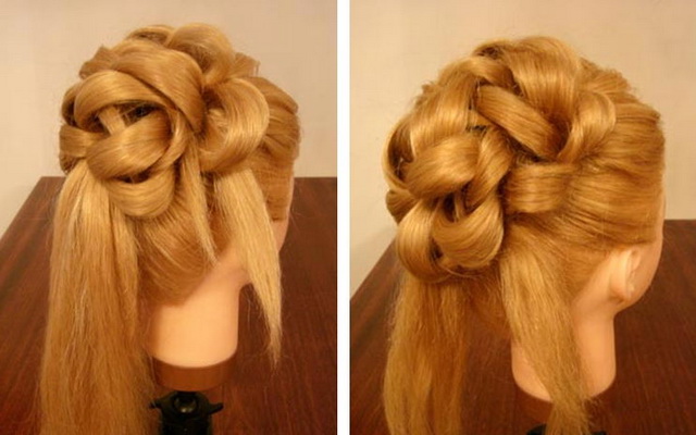 - Прическа выполняется на длинных волосах твердой формы. Хвост из всей массы волос располагается на макушке, разделяется на пять равных прядей, которые сначала тупируются с внутренней стороны пряди, отчесываются и выкладываются по кругу.