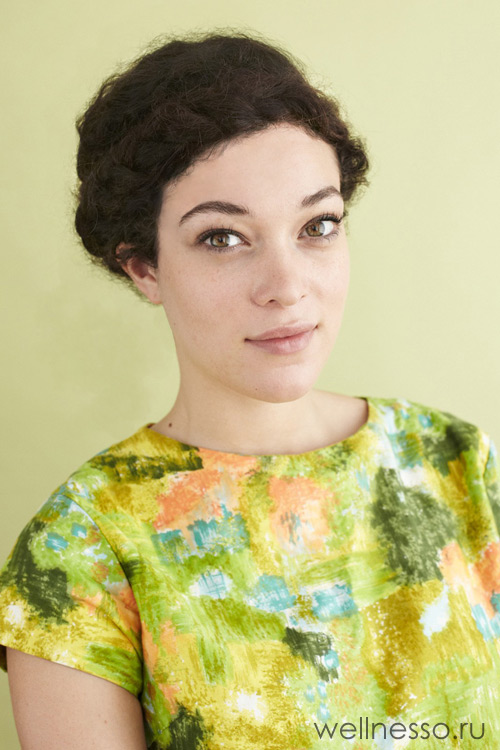 45. Эта прическа с пучком подойдет под вечерний макияж. Сначала заплетаем полуободок, используя технику «полуколосок наоборот». Плетение слегка расправим. Далее собираем низкий хвост, надеваем поролоновый валик и формируем пучок. Кончики волос прячем под пучком, а вокруг него накручиваем, скалывая шпильками, заплетенную ранее косу. Остается только уложить набок челку и пригладить прическу, сбрызнув стайлингом.