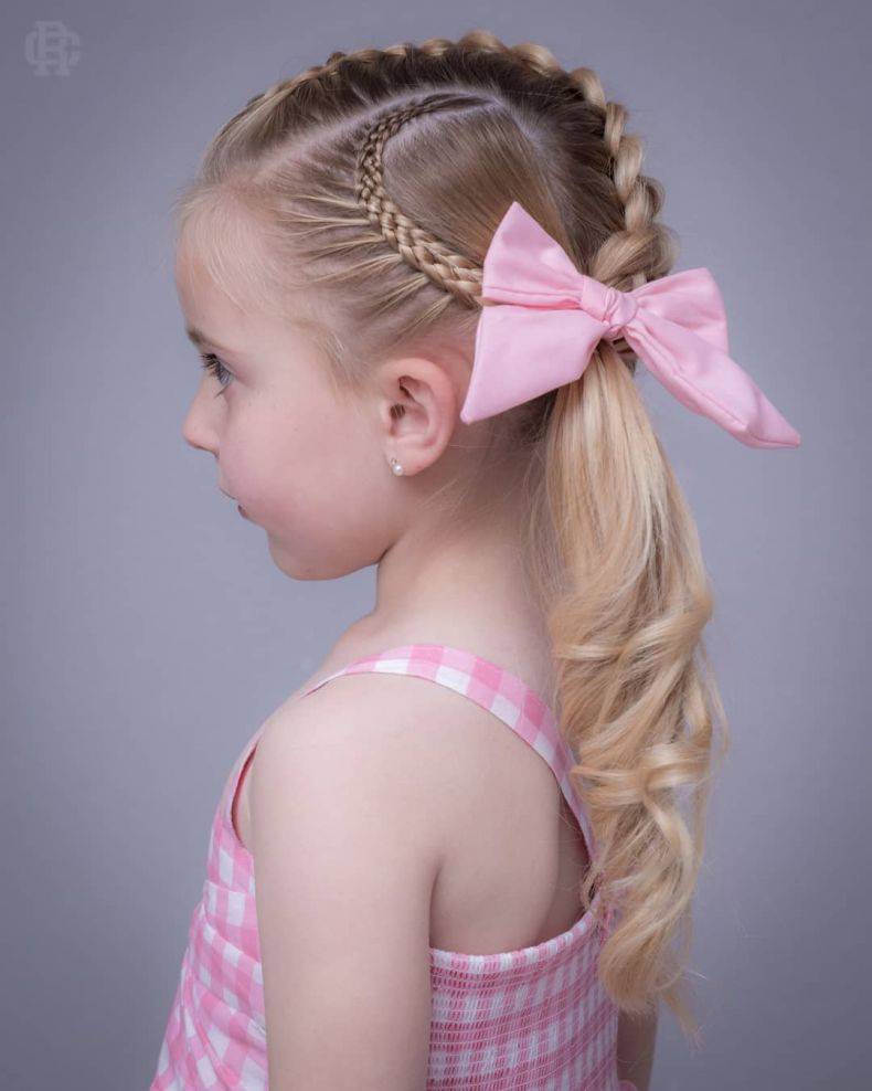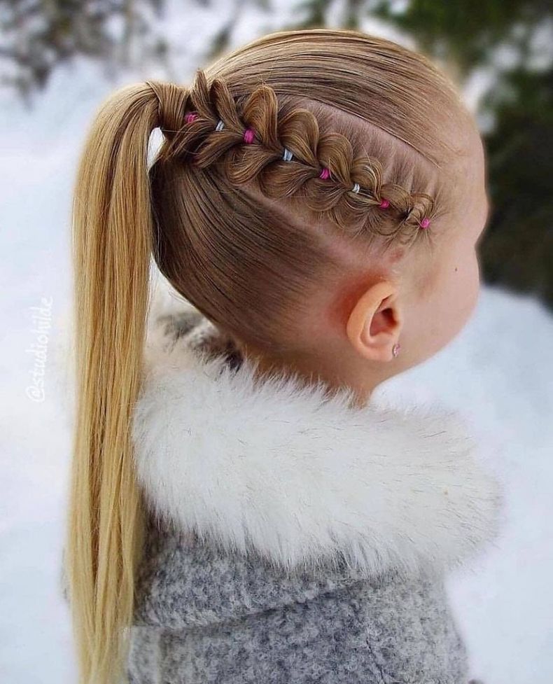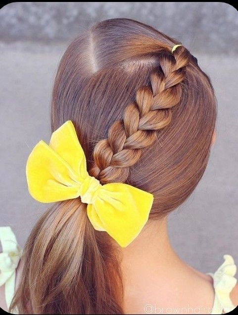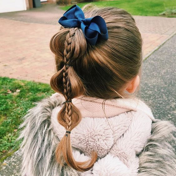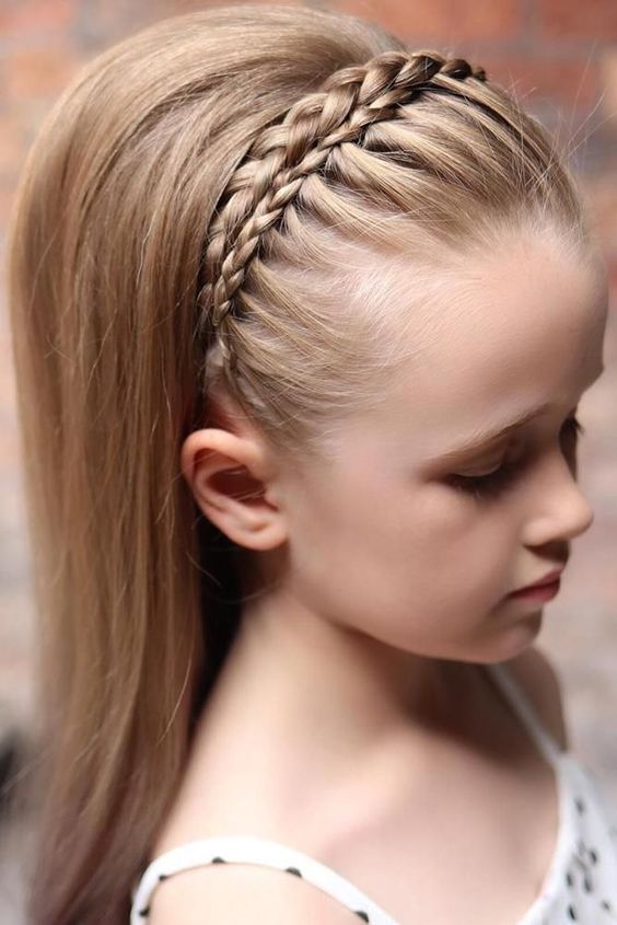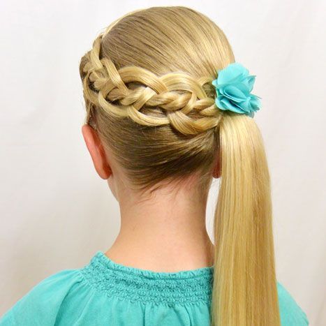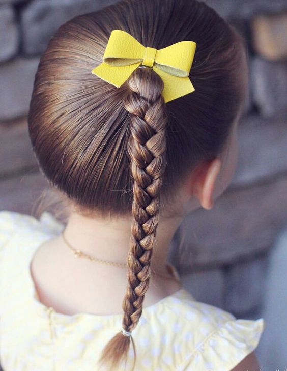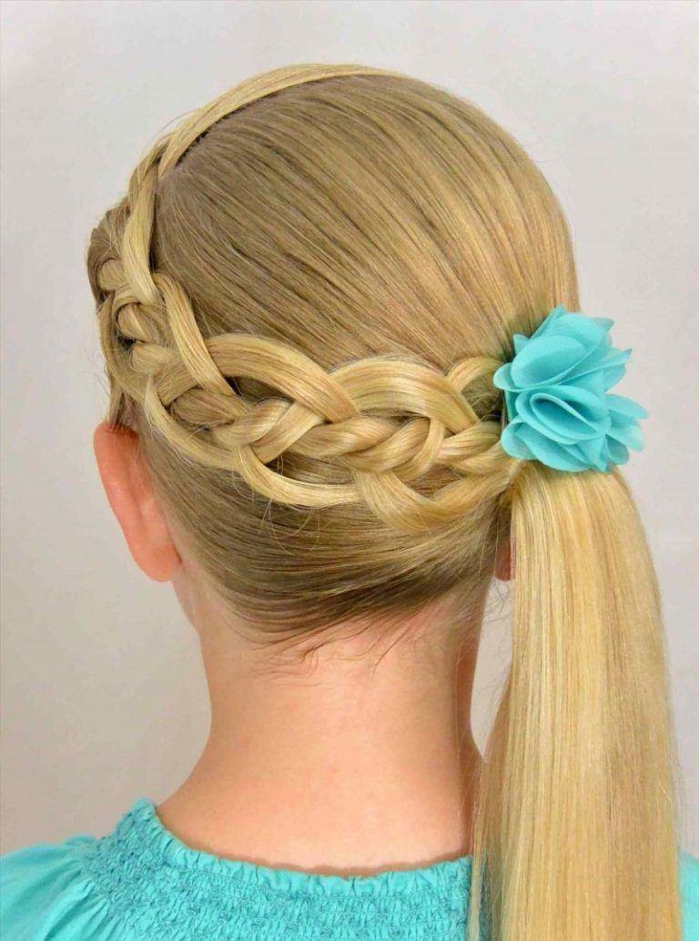 Делят все локоны на голове на три части и заплетают косу на бок, либо формируют её прямо на высоком хвосте. Укладка станет отличным повседневным вариантом оформления детских волос.