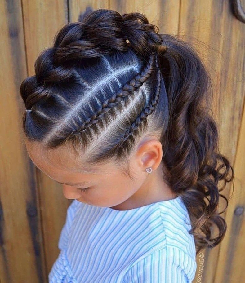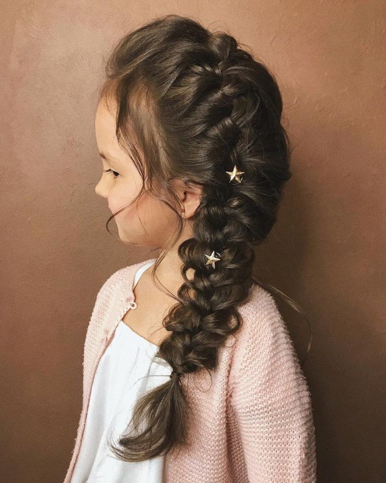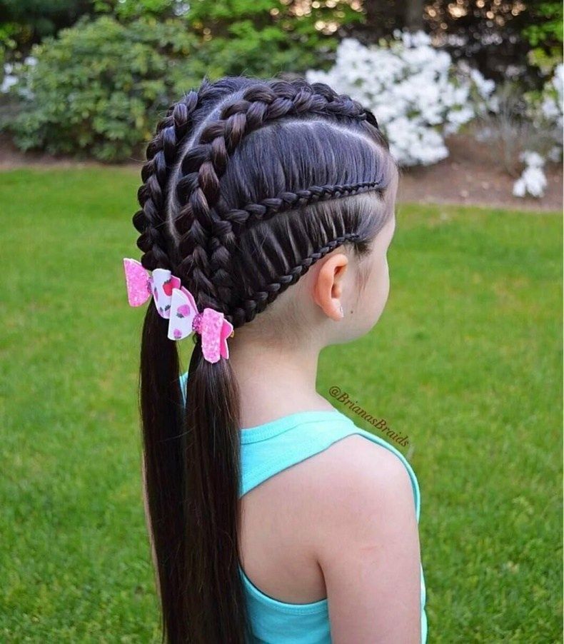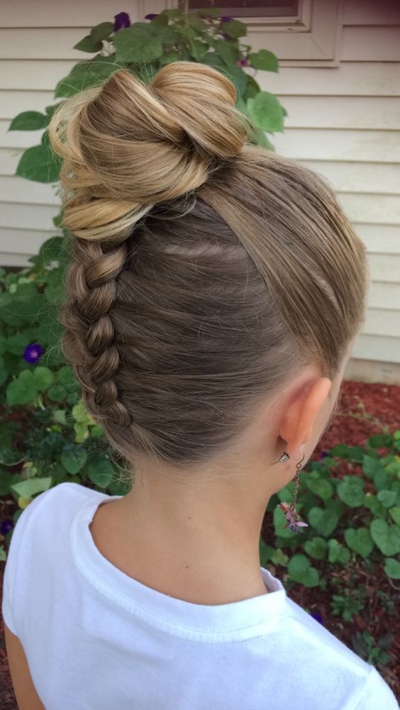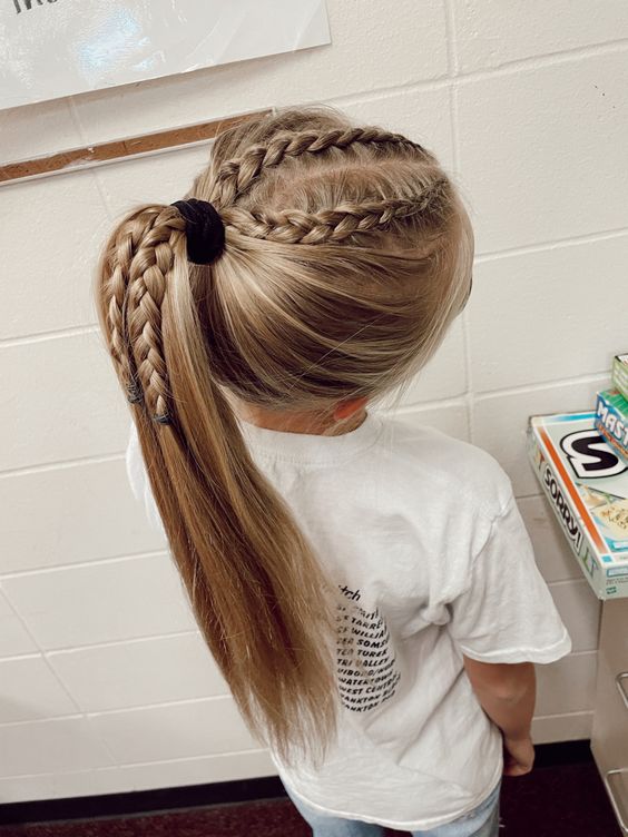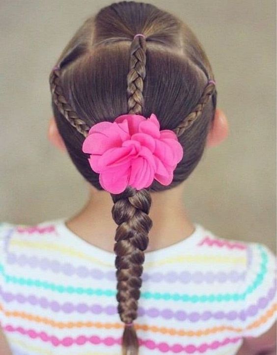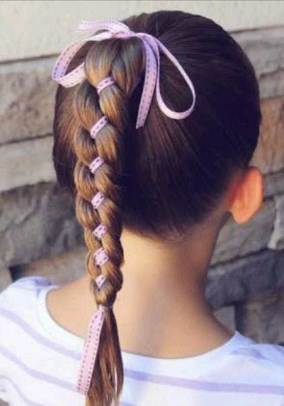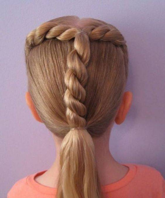 Делят все локоны на голове на три части и заплетают косу на бок, либо формируют её прямо на высоком хвосте. Укладка станет отличным повседневным вариантом оформления детских волос.