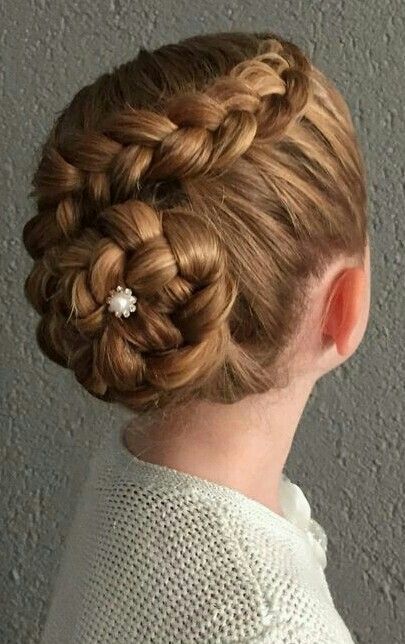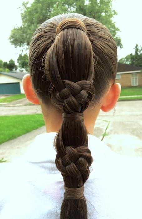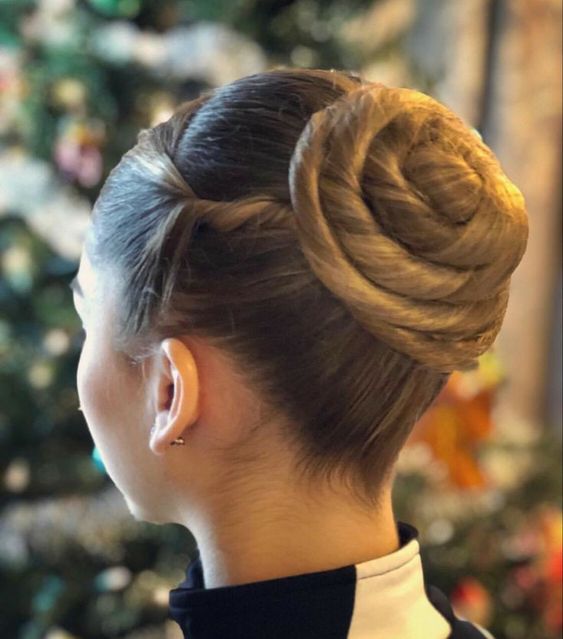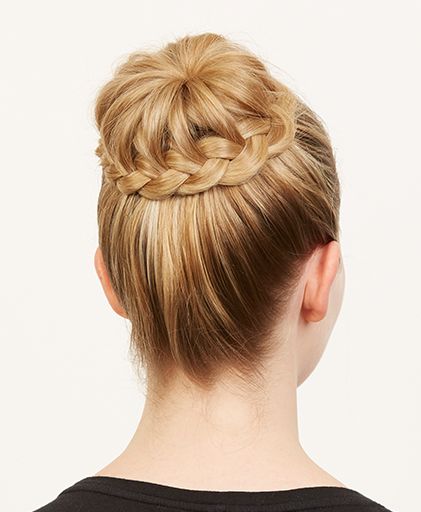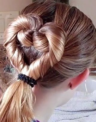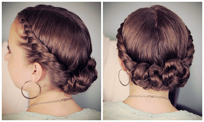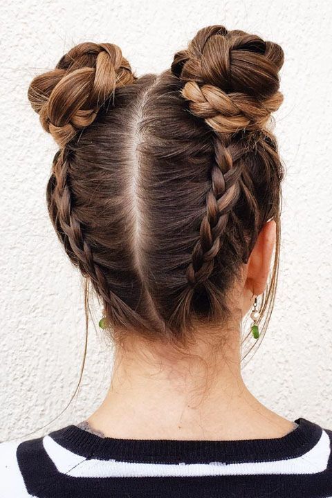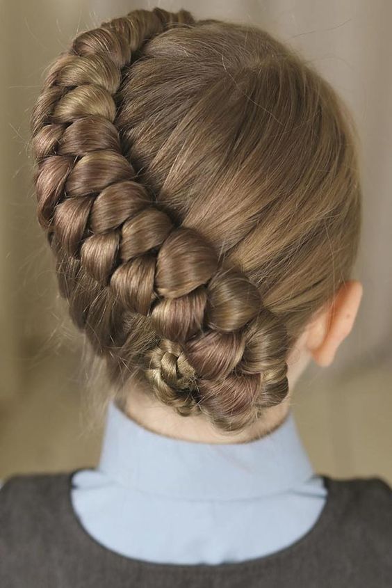 Причёска отлично подходит для длинных локонов. Их собирают в высокий конский хвост, плетут из хвоста косу и оборачивают её вокруг основания, закрепляя резинками.