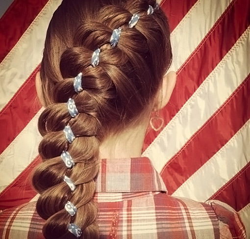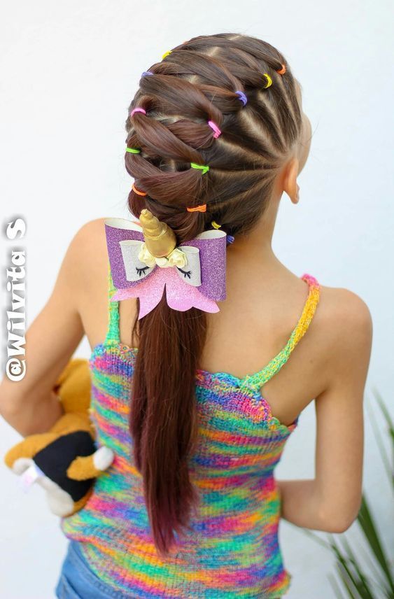 Если в наличии имеются разноцветные резинки, можно сделать крутую укладку для любого дня в году. Достаточно выполнить несколько хвостиков и объединить в один большой.