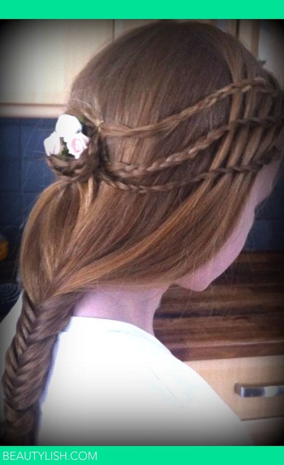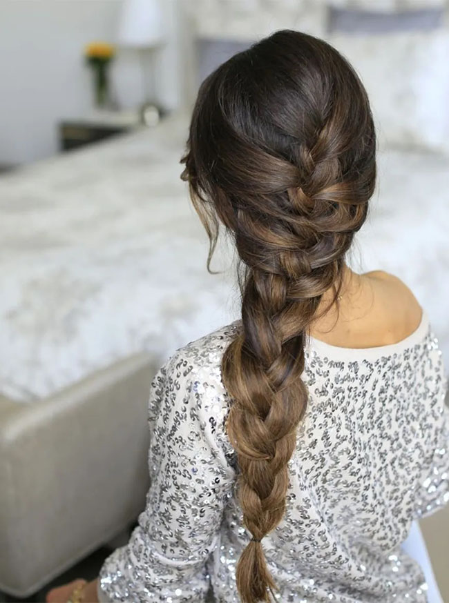 Волосы делят на пробор по центру. С одной стороны берут небольшую прядку, заводят вовнутрь, аналогичным образом поступают со второй стороной. Скрещивают между собой пряди и так действуют до конца длины волос. Закрепляют рыбий хвост резинкой.