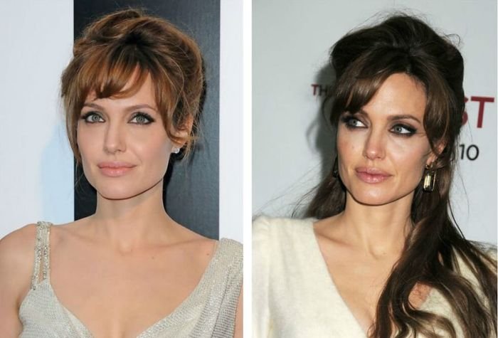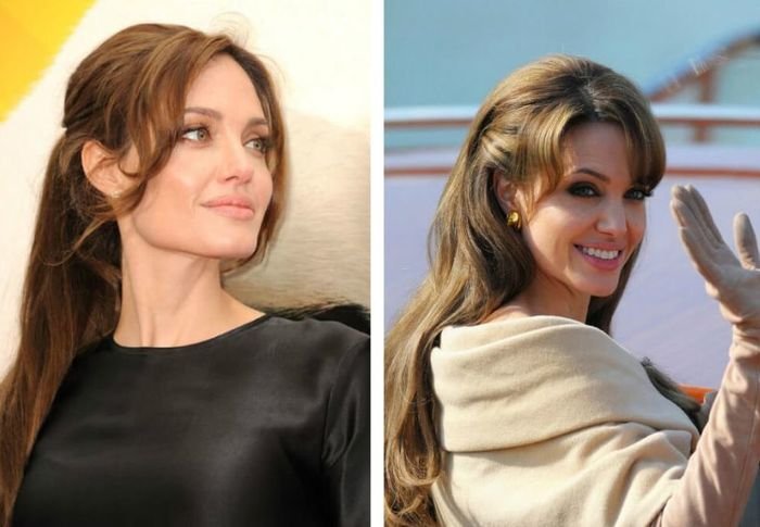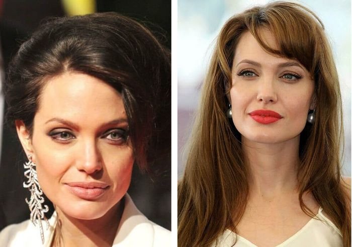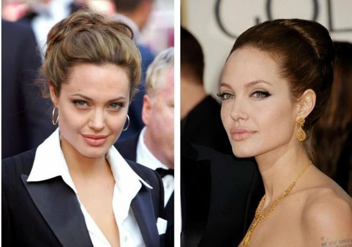 Под личико такой формы можно подыскать любой торжественный вариант. Большинство вечерних укладок основаны на подобранных вверх волосах, а также волнах и кудрях. Опасайтесь зачесанных назад прядей. Замените их начесом в области скул и висков. Разобраться в этой теме вам помогут эти фото. На них – Анджелина Джоли, пожалуй, самая яркая и красивая обладательница личика такой типа.