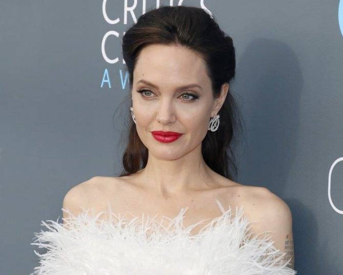 Анджелина Джоли надела потрясающее белое платье без бретелек с перьями, которое сочеталось с ее прекрасной прической наполовину на 23-й ежегодной церемонии вручения награды Critics ‘Choice Awards, проходившей в ангаре Barker в Санта-Монике, США, 11 января 2018 года.