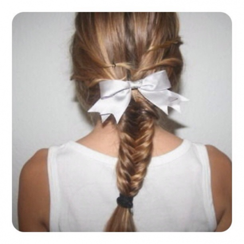 Отличным вариантом для девочки с длинными волосами будет прическа под названием «рыбий хвост». Но речь идет не о классическом варианте, а об асимметричном. Для этого сделайте зигзагообразный пробор и просто заплетите волосы в классической технике. Когда коса будет готова, распушите пряди, поочередно вытягивая их сверху вниз.