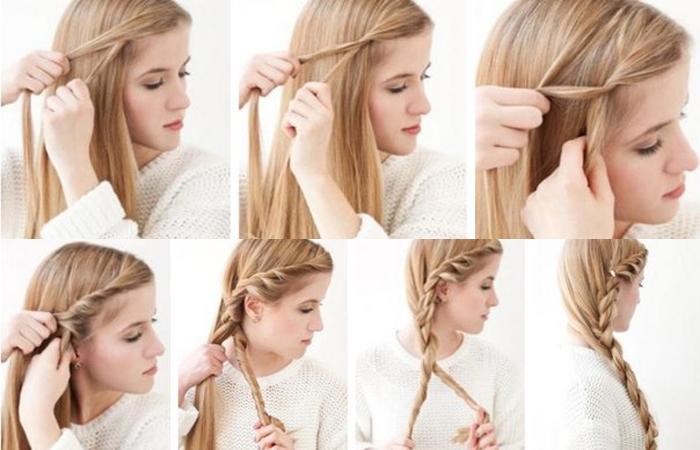 Девочки-подростки оценят более сложные, но в то же время необычные прически. К примеру, «каскад» смотрится особенно красиво на волосах средней длины или же длинных. С помощью такой прически волосы можно убрать от глаз, поэтому они точно не будут мешать на занятиях. Для начала зачешите волосы набок и сверху отделите только две пряди, как на фото. Соедините их силиконовой резинкой. Выверните хвост и сделайте из двух других прядей еще один маленький хвост. Повторите то же самое и слегка вытяните пряди для большего объема.