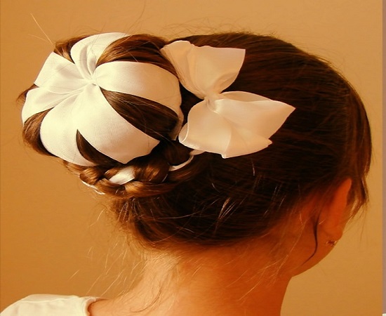 Для того, чтобы прическа смотрелась празднично, кончики волос следует завить плойкой и добавить банты или ленты для волос.