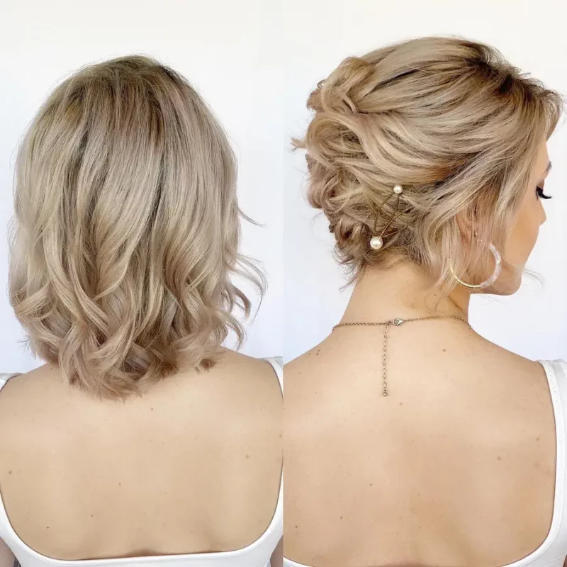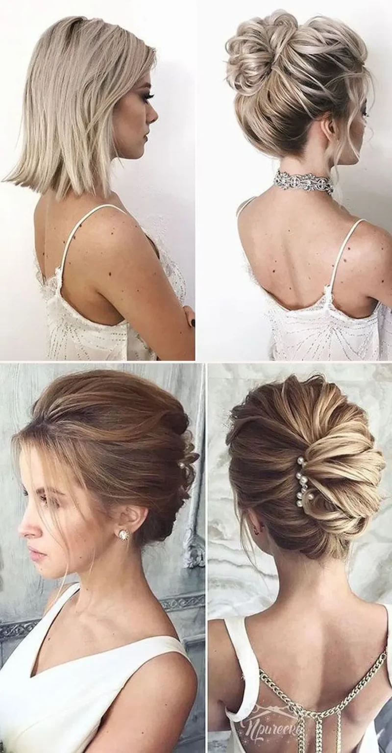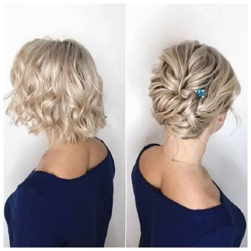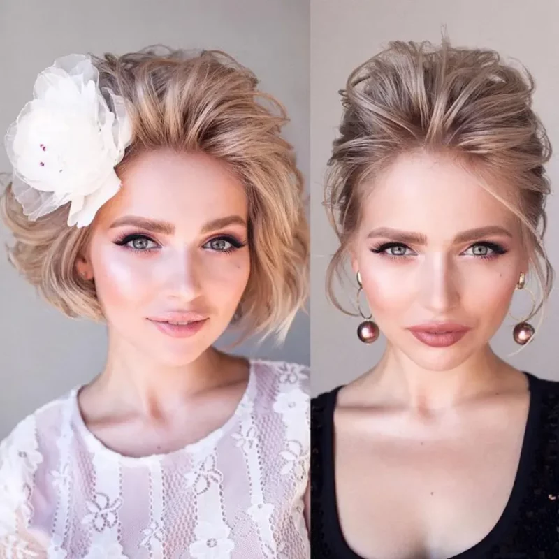 Хорошо смотрятся стрижки с эффектом растрепанных волос. Короткое каре можно подкрутить, благодаря чему появится необходимая женственность и торжественность. А модная стрижка пикси укладывается гладко с полным прилеганием. Для этого используются специальные фиксирующие средства. Но даже в этом случае можно добавить легкого романтизма с помощью шпилек, украшенных маленькими цветочками. Цвет их должен совпадать с платьем. И наконец, короткую стрижку можно украсить аккуратной диадемой.