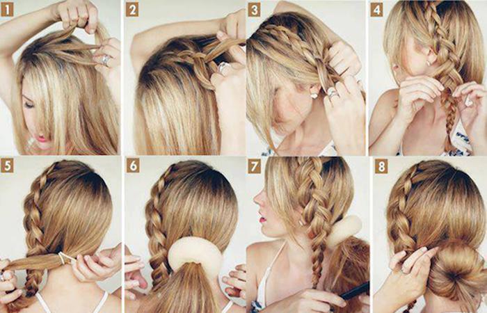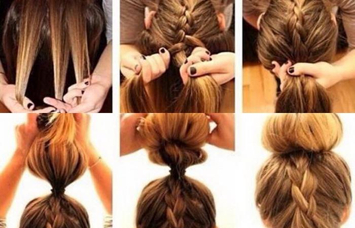 Пучок с фрагментом плетения выполняется просто, но выглядит эффектно, модно и свежо. Косу можно заплести ото лба или от шеи, каждый вариант буде актуален. Рассмотрим вариант с обратной косой. Для выполнения укладки опустите голову вниз, волосы распустите. Пряди возле шеи вплетите в косу. Соберите локоны с косой в высокий хвост, закрутите пучок. Взбрызните лаком, можете украсить небольшой заколкой, бантом, ободком.