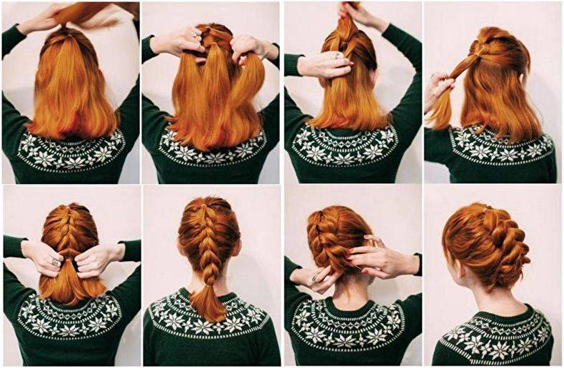 Для обладательниц каре и локонов средней длины также найдется подходящий вариант пучка. Для этого сделайте боковой пробор, подкрутите волосы на плойку. Отделите локоны возле ушей. Соберите волосы сзади в нижний пучок. Сплетите французскую косу из оставшихся прядей вдоль контура лица, подколите ее к пучку. Короткие, выбивающиеся прядки подколите невидимками. Взбрызните укладку лаком.