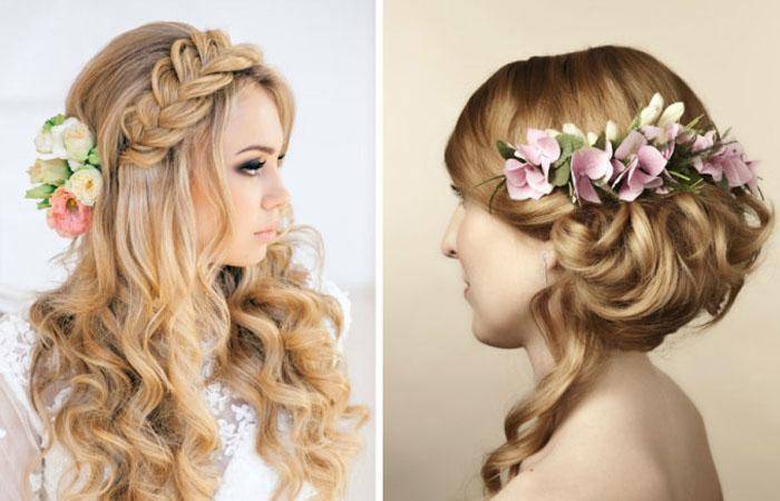 Для тех, кому в вечернем образе не хватает нежности, романтики, стилисты советуют обратиться к цветам. Небольшие веточки, одиночные цветы, крупные или мелкие элементы — ваш выбор зависит от укладки и длины волос.