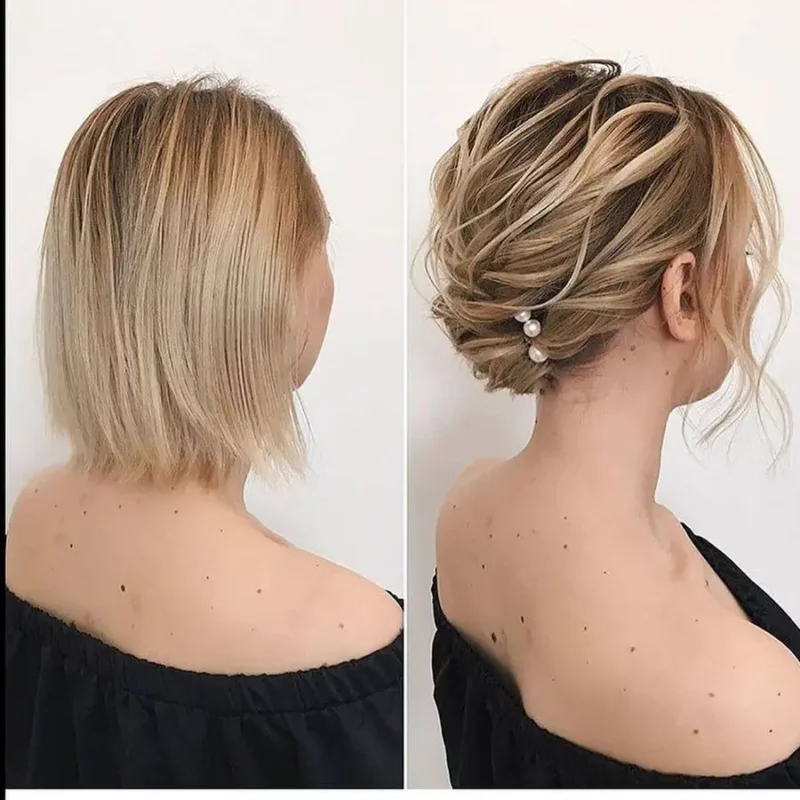 Наличие коротких волос еще не означает отсутствие прически на выпускной. Если девушка носит ультра короткую стрижку, она всегда может прибегнуть к помощи заколок с декоративными хвостами. Выглядят они достаточно стильно. Главное, чтобы они сочетались в собранном луке по цвету, форме.