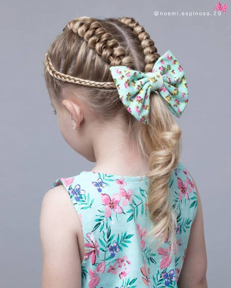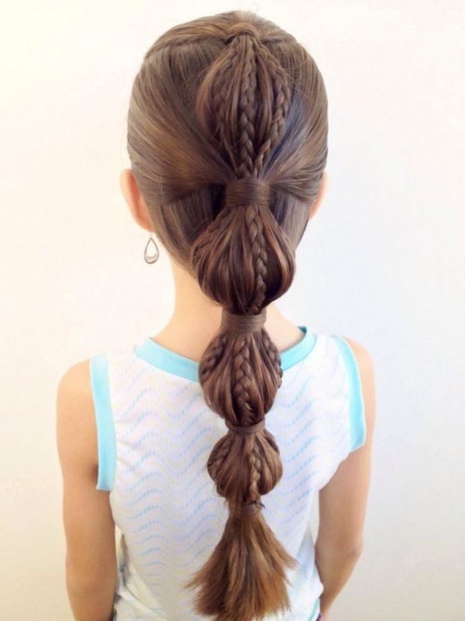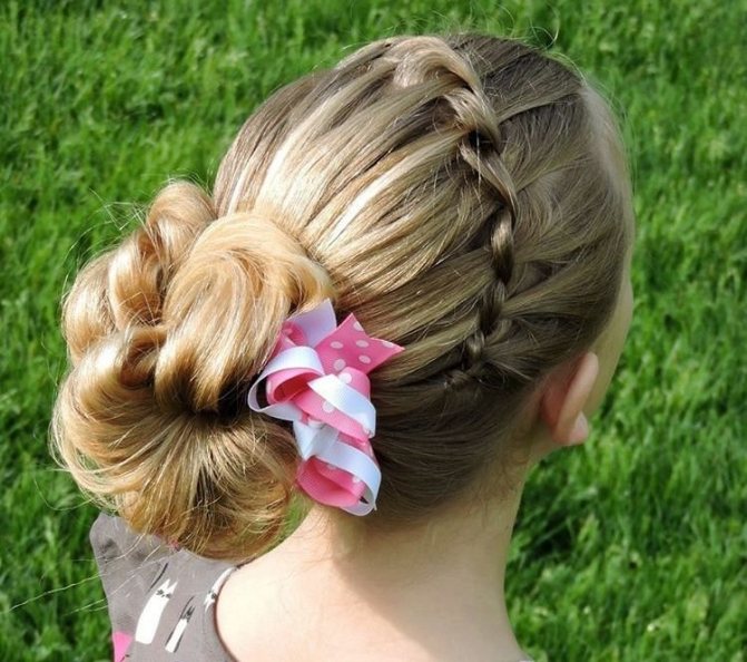 - Длину волос. Если дочка имеет длинные волосы, то можно сделать красивую косу или пучок с красивыми аксессуарами. Если же длина волос недостаточна, то можно добавить накладной хвост, закрепив его украшением или собрать аккуратный пучок.