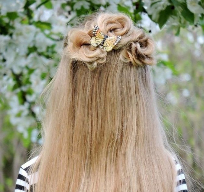Длинные волосы накрутите на бигуди или плойку, верхнюю часть отделите, выполните небольшой начес. Аккуратно уложите волосы на макушке, зафиксируйте лаком. В завершение украсьте ажурной заколкой, бантом.