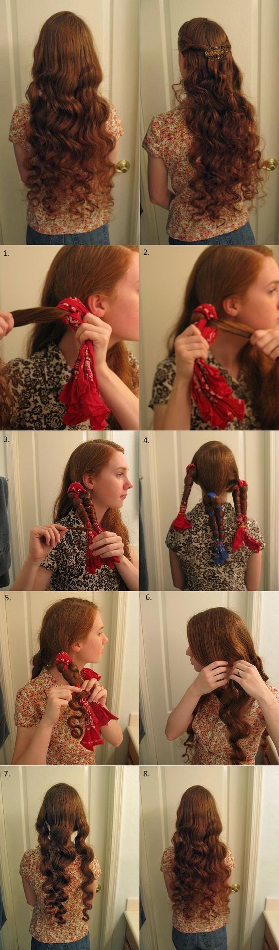 Для этого способа необходима небольшая подготовка. Нужно взять несколько небольших тряпочек примерно длиной сантиметров пятнадцать и шириной где-то два. На каждую из них наматывается прядь волос, а затем веревочка завязывается. Делать также надо все на влажные волосы и оставлять на ночь.