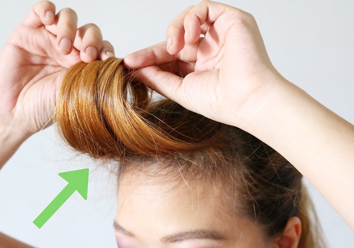- Теперь прядь волос на макушке головы необходимо начесать, но делать это нужно очень аккуратно. После получения объема, эту часть волос скручиваем в тугой жгут, после чего закрепляем шпильками.