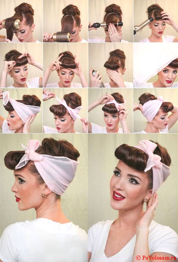 Как создать прическу в стиле пин ап и красиво оформить платок на волосах, наглядно продемонстрируют пошаговые фото.