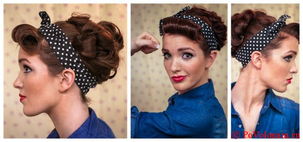 Повязка должна обязательно подходить по цвету к вашему наряду. Такой вариант прически пин-ап на средних волосах смотрится очень эффектно.
