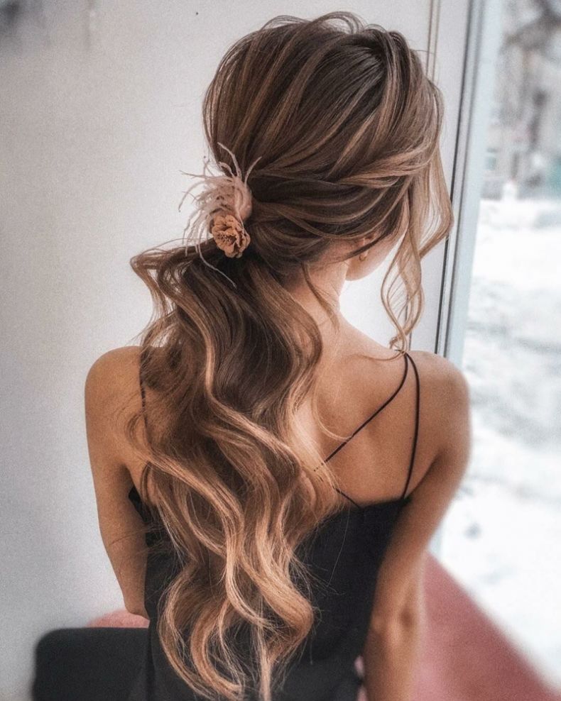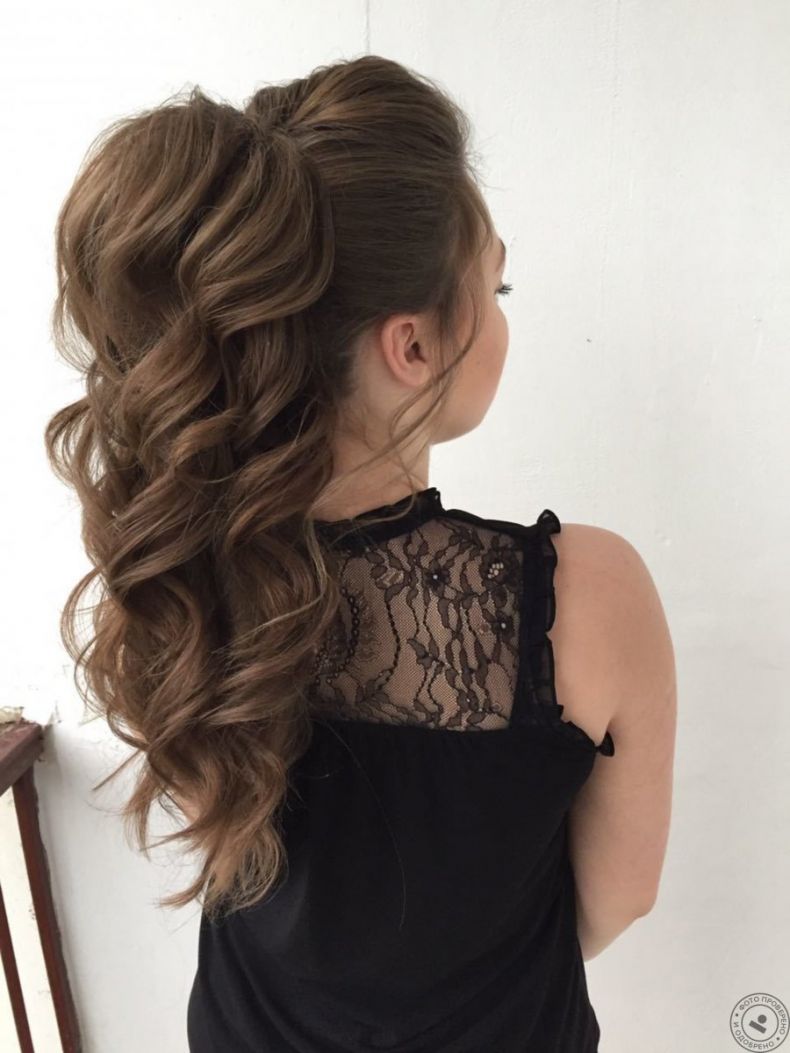 Пышный завитой хвост дополнит собой любой праздничный выход. Сочетается он как с платьем, так и с комбинезоном или брючным костюмом. Оформить его можно так, что получится романтичная или более неформальная прическа.