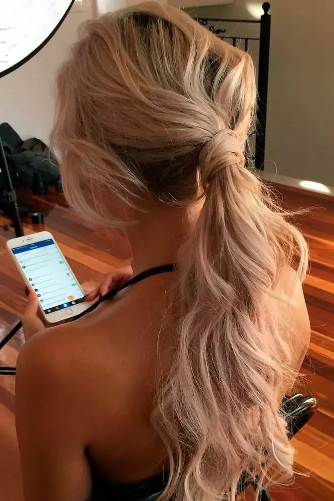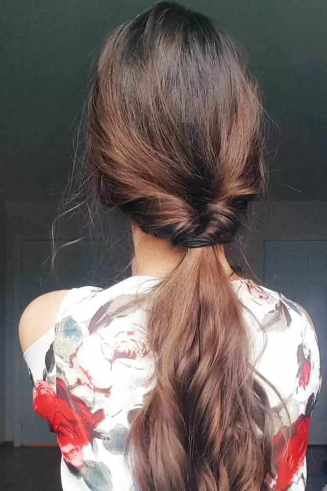 Прическа отличается простотой. Если у вас нет времени, все, что вам нужно сделать, это зачесать локоны назад и закрепить их резинкой по своему усмотрению