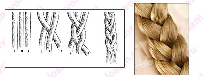 - Правая прядь будет зваться первой. Она кладется под вторую, а третья кладется сверху первой;