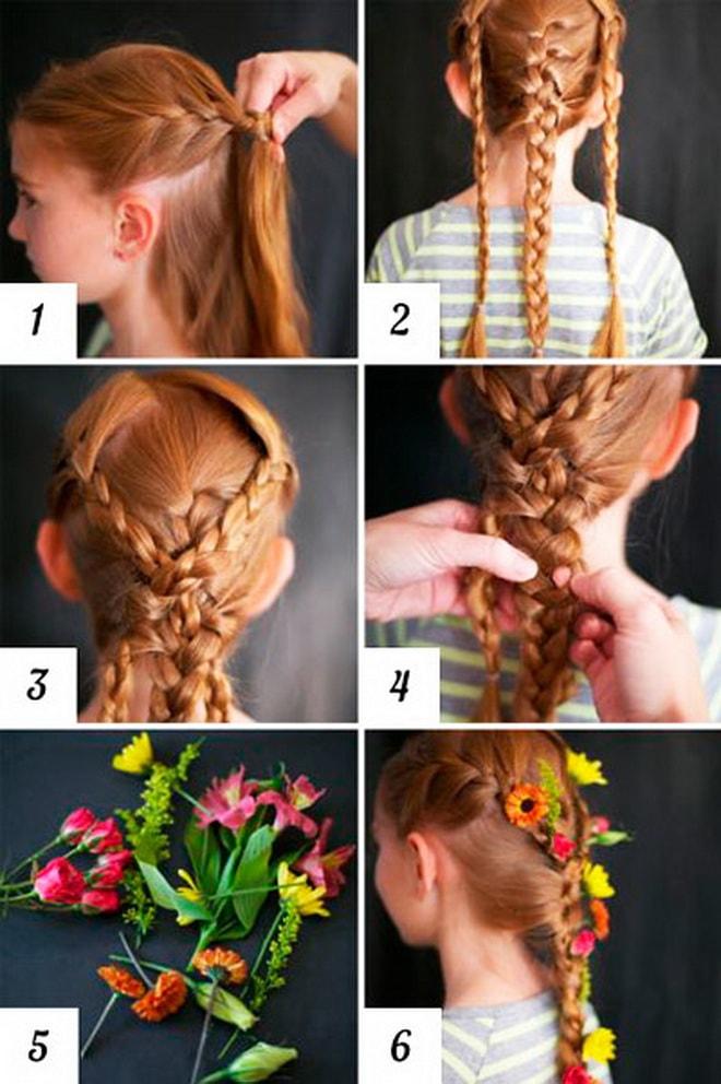 Ощущение первых лучей солнца придают букеты ярких цветов в рыжих волосах. Сама прическа демонстрирует, как заплести косу девочке красиво и просто, потратив на это не больше пяти минут.
