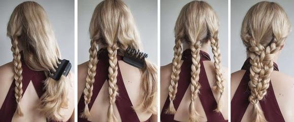 - Вся шевелюра зачесывается назад и делится на четыре равные пряди;