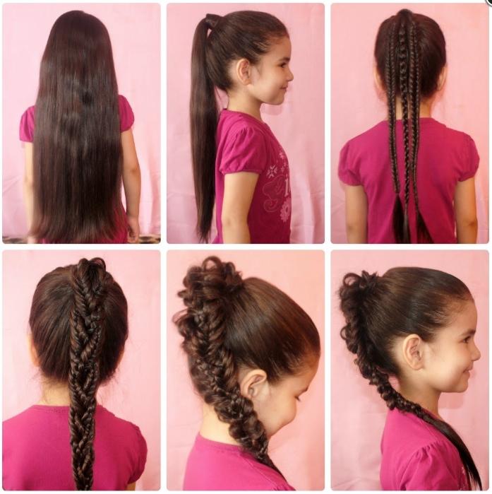 Воспользовавшись этой же техникой, можно сделать прическу девочке в садик или школу. Тогда хвостики косичек не прячут, а украшают интересными заколками, которые выберет ребенок по своему желанию.