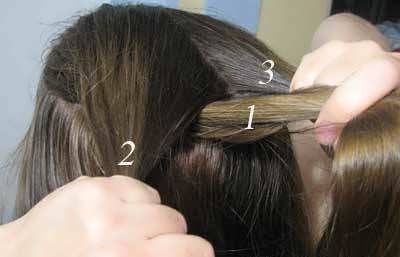 - У лба берется прядь и делится на три части;