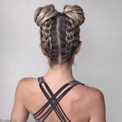 - Если волосы на затылке более короткие, чем на макушке, можно заплести косу «вверх ногами». Верхние пряди могут быть уложены в хвостики или пучки.