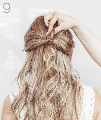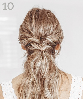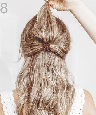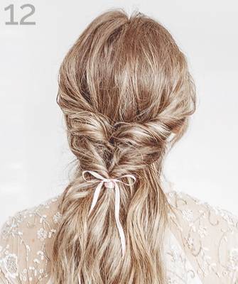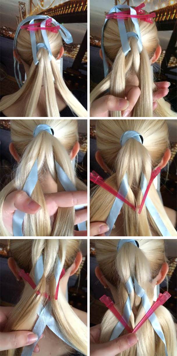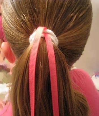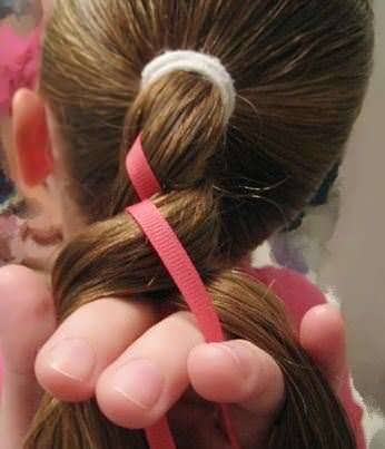 Чтобы сделать более элегантную укладку, завяжите хвост на затылке резинкой, затем проложите ленту вдоль окружности головы, завязав узел под резинкой, и оберните концы ленты вокруг основания хвоста.
