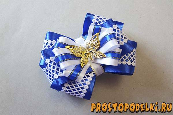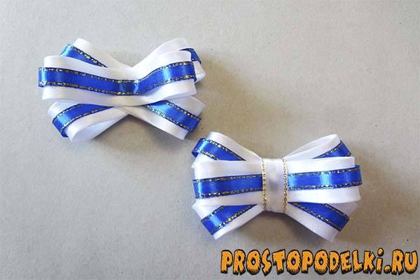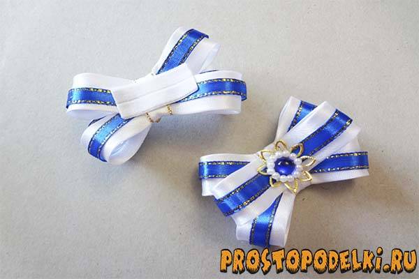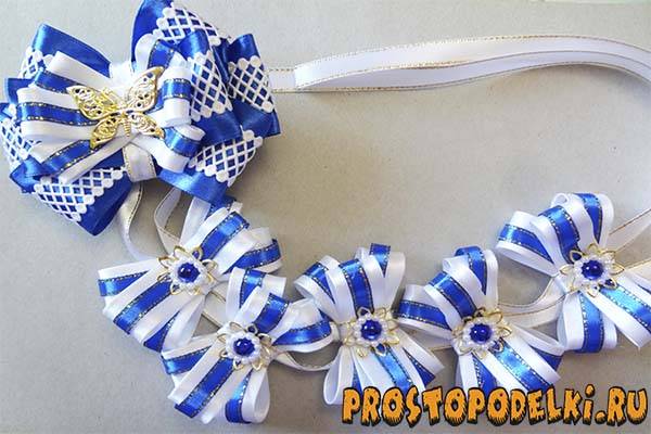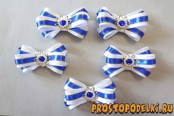 Сделайте 5 одинаковых маленьких бантиков, к серединке каждого из них добавьте красивую самодельную конструкцию с обнимателем, которую мы изготовили ранее.