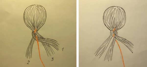 - Крайнюю слева прядь располагают сверху второй, затем проводят ее под тесьму и поверх крайней справа.