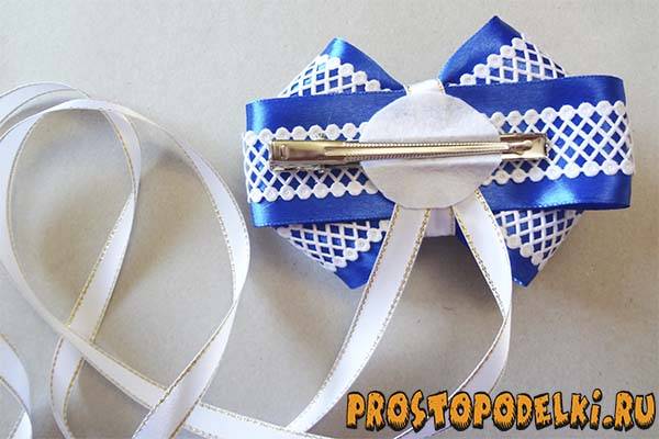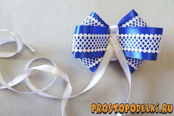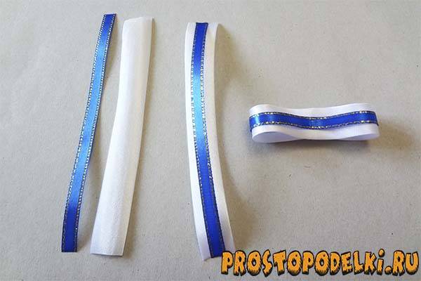 2 отрезка длинной белой ленты с люрексом концами подклейте к большому банту.