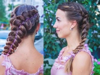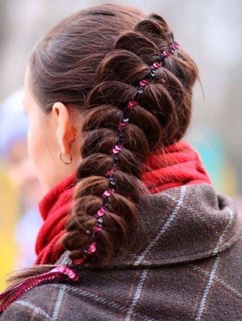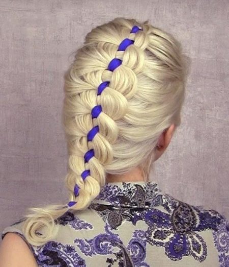 Стилисты предлагают использовать яркие ленты, наматывая всю их длину на хвост. В итоге получается подобие плотной трубки, внизу которой виднеются концы локонов.