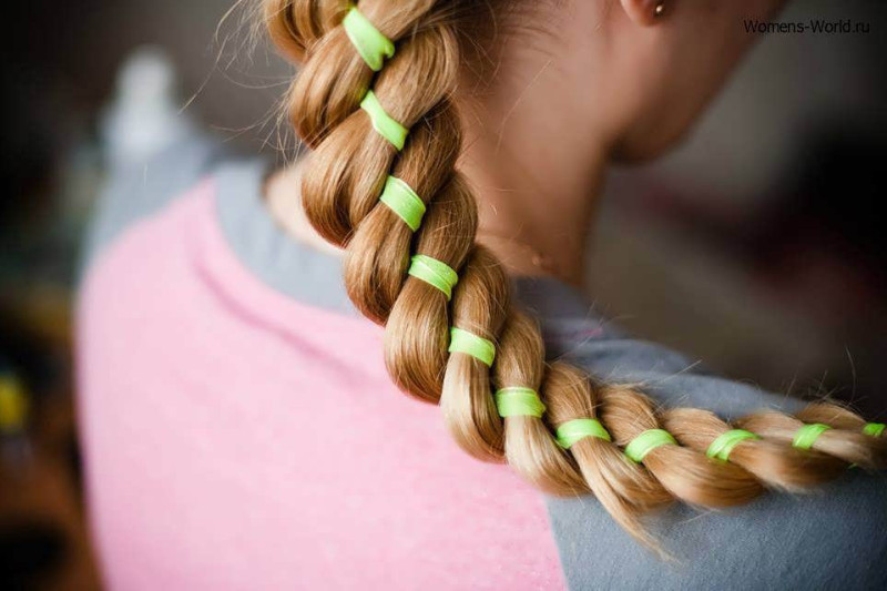 - Перечисленные шаги повторяются до самого конца косы, снизу ее закрепляют резинкой.