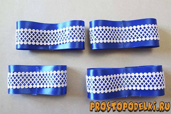 С обратной стороны каждого бантика подклейте стрейчевую бейку или плотную резинку, но центральную часть не промазывайте клеем. В дальнейшем каждый бантик будет двигаться по основной ленте.