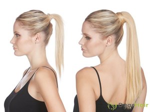 - Шиньон-хвост. Обычно надевают такое украшение на короткие волосы, желая придать им большую длину. Также могут использовать его и для придания объема тонким волосам. Надевать его легко поверх своего хвоста, скрепив все это резинкой, лентами или заколкой. Способ, которым можно приделать такой хвост, зависит от модели накладки. Если вы хотите создать высокую прическу, то свои волосы собирают в пучок на затылке, а шиньон из натуральных волос в виде хвоста надевают наверх для создания высокой посадки. Крепится он обычно «крабом».