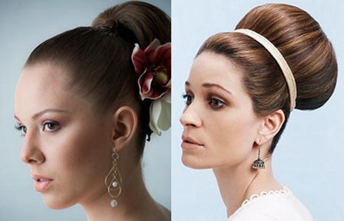 Шиньон-бабетта, собранные в тугой валик волосы – классика постижей. Для большего эффекта собираем собственные прядки в хвост на затылке, крепим поверх них шиньон, начесываем и укладываем с муссом либо лаком волной. Готовую «бабетту» надежно крепим, а оставшуюся после фиксации прядку оборачиваем вокруг начесанного валика. Повяжем поверх красивую ленту в тон платья либо наденем эффектный ободок.