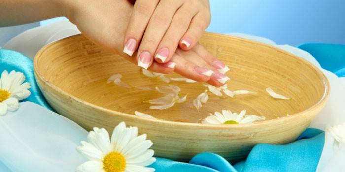 Самый доступный и простой метод для тех, у кого ногти на руках слоятся – это солевые ванночки. Для их приготовления нужна поваренная соль и 1 л теплой воды. Кроме того, ванночку можно дополнить ароматными маслами или травами. Такие процедуры значительно укрепляют ноготки. Ниже представлено несколько рецептов лечебных ванночек от слоения ногтевых пластин: