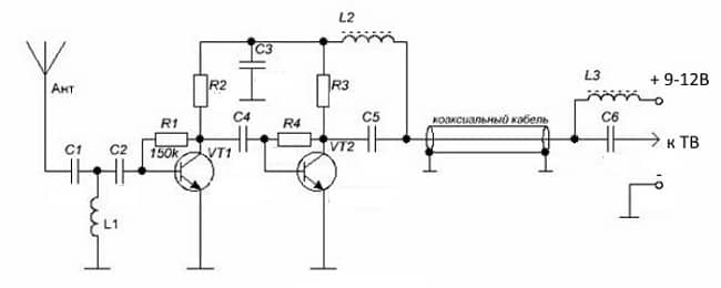 В местах, где в относительной близости не расположена мощная ретрансляционная башня, можно поднять уровень сигнала до приемлемого значения при помощи усилителя. Ниже представлена принципиальная схема устройства, которое может использоваться практически с любой антенной.