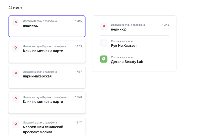 Следит в разделе «Как вас находят», где и по каким запросам люди ищут её студии. Если клиент по своему запросу сначала посмотрел профиль компании-конкурента, а затем перешёл в «Детали Beauty Lab», Анастасия это увидит.