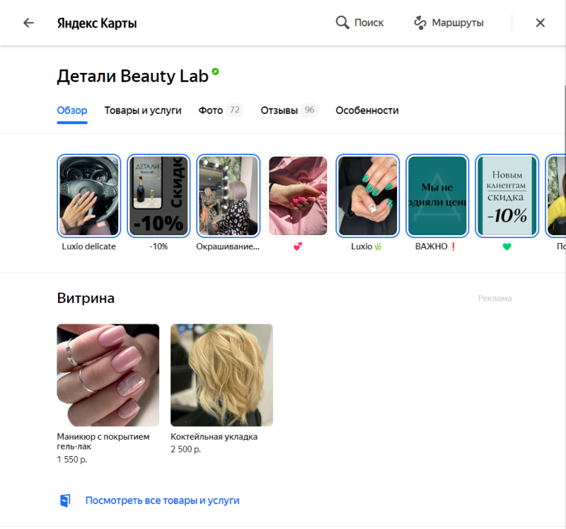 Посетители видят сториз в разделе «Обзор» в Яндекс Картах. Такие публикации не пропадают через 24 часа — посмотреть предложения студии и работы мастеров можно в любой момент