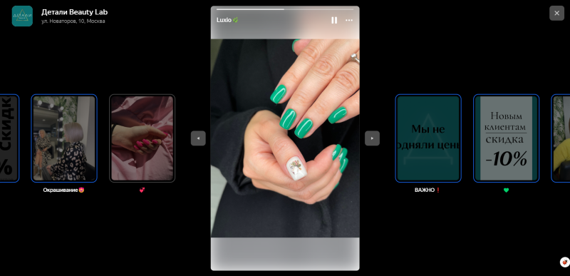 Ещё через Карты администраторы публикуют сториз — пишут в них об акциях и показывают работы мастеров.